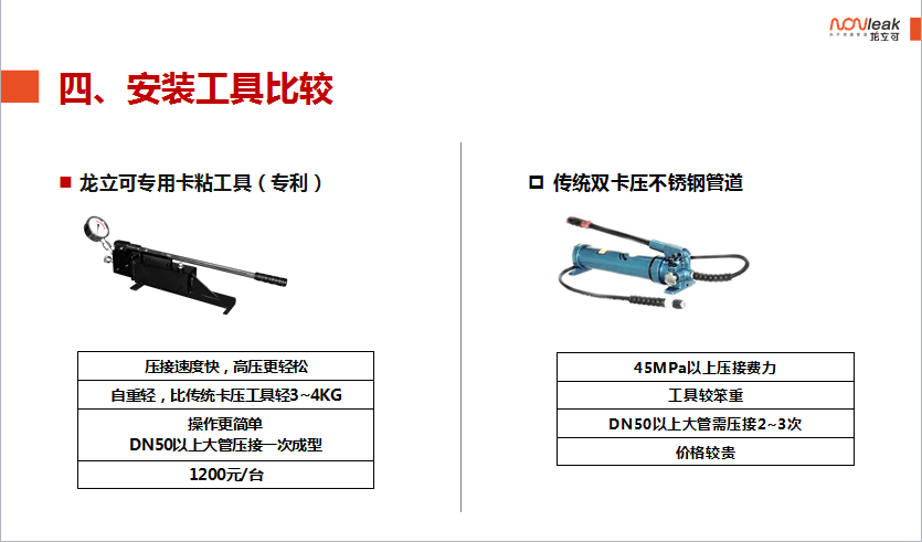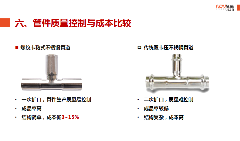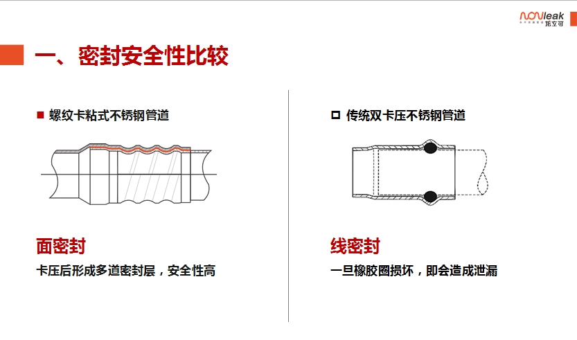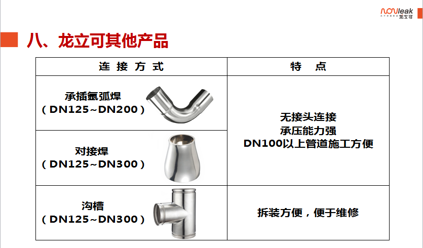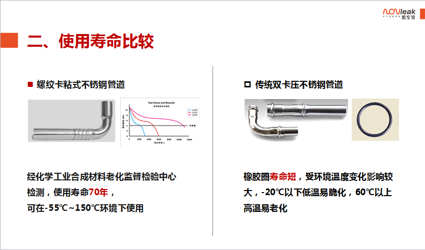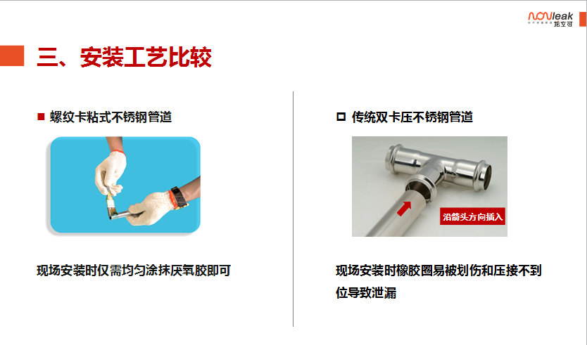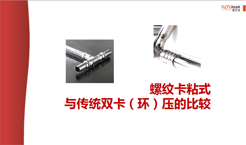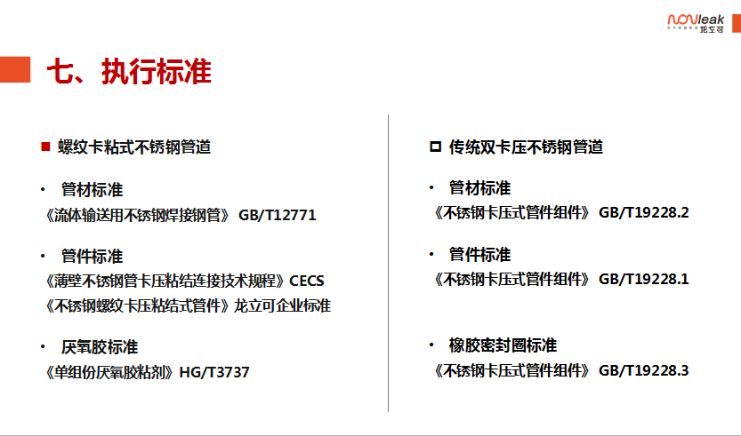 龙立可产品的螺纹卡压粘接式薄壁不锈钢管是以上标准所述的机械式连接、粘接式连接的综合体。产品采用机械式卡压的方式利用专用厌氧胶粘接剂(符合HG3737《单组份厌氧粘接剂》相关标准)将管材和管件牢固的结合在一起。